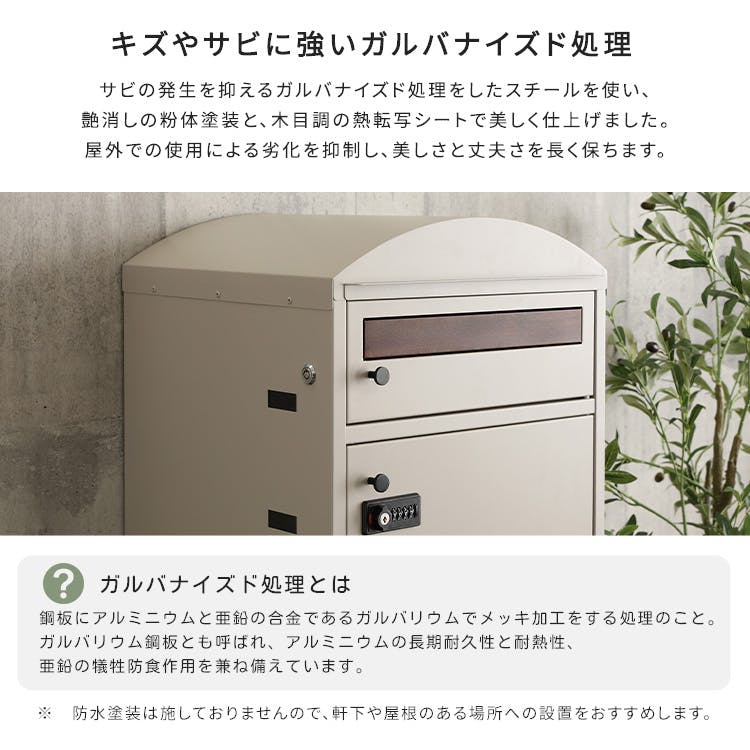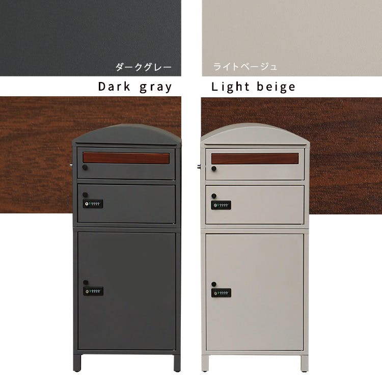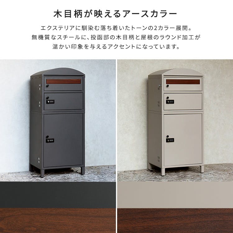 完成品(脚のみ取り付け) 防水塗装はしておりませんので、軒下や屋根がある場所への設置を推奨しております。 マンションやアパート共有部に設置の場合は事前に管理者にご確認ください。 開梱時カッターでで商品を傷つけないようにご注意ください。 付属品:印鑑ケース×3個、アンカーボルト、宅配業者向けマニュアル