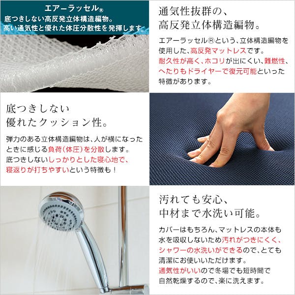 ファインエア【ファインエア二段ベッド用450】(体圧分散 衛生 通気 二段ベッド 日本製)高さのあるベッドにピッタリな厚さ5cmの薄型マットレス!約4kgと軽いから上げ下ろしもラクラク♪通気性抜群の高反発立体構造編物(エアーラッセル)を採用!体圧分散性が高く、しっかりとした寝心地で、寝返りも打ちやすい!水洗いができるから、いつも清潔にお使いいただけます!
