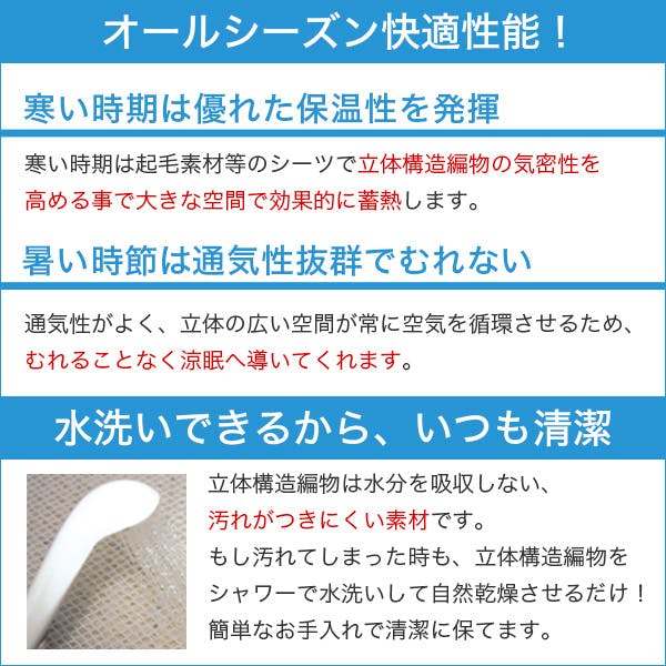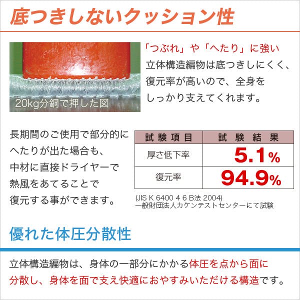 安心の日本製!クッション性、耐久性に優れた高反発のマットレスです!強力糸で支える立体構編物により底つき感を減らして全身を支えます!また、へたりに強く復元率95.9%の優れた耐久性!電気毛布や湯たんぽと併用可能!夏用にも冬用にも使えるマットレスです!