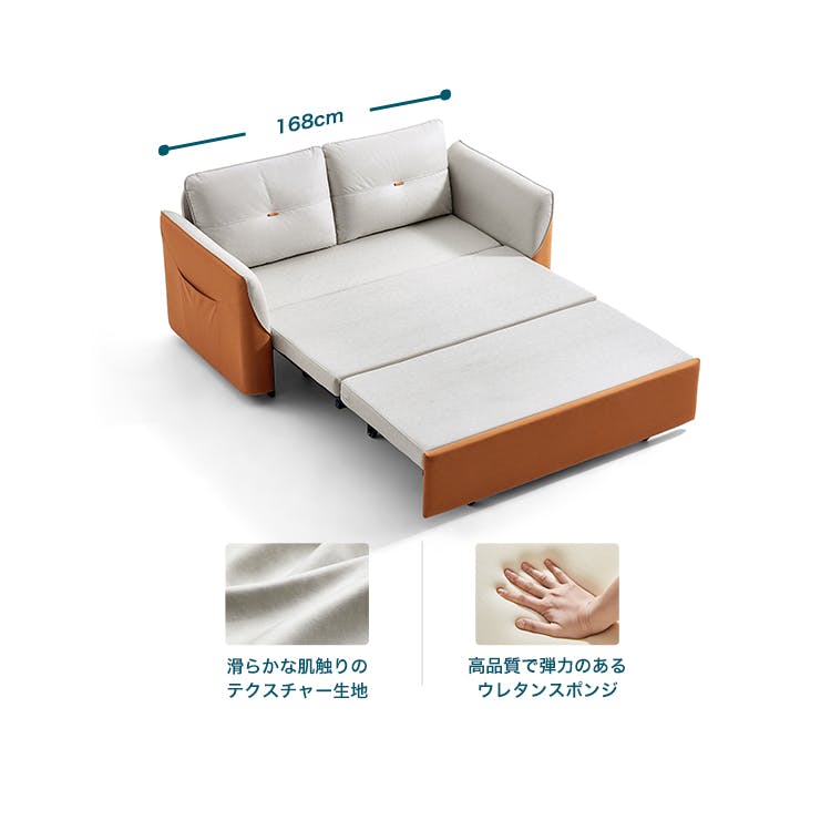 この商品は、ソファとベッド両方の用途に対応する幅168cmサイズの多機能ソファベッドです。高品質で弾力のあるウレタンスポンジと肌触りの良いポリエステル生地を採用し、快適な座り心地と寝心地を提供します。カバーは座面、クッション、背もたれ部分が固定式で、お手入れもシンプルです。
