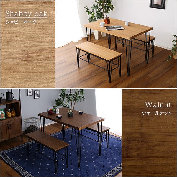 ヴィンテージダイニング3点セット【テーブル+ベンチ2脚】!ベンチはブラックアイアン×木目の相性抜群でカフェのような雰囲気を演出します。カップルやファミリーの方におすすめです。デスクワークやリビングでお子様の学習テーブルとしてもお使い頂けます。使わないときはテーブルの下にコンパクトに収納できます。しっかりとした厚み4cmのある天板は高級感のあるシャビーオーク、ウォールナット柄を側面、裏面にも施し食卓を上品に演出します。水や汚れに強いPVCを使用しておりますので、軽く拭くだけでお手入れ簡単です。