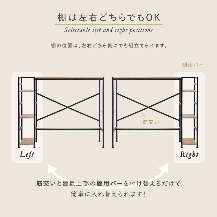 立ちながら作業ができるスタンディングデスク!スタンディングデスクは姿勢改善、カロリー消費、血行促進、腰痛予防など、総合的な健康改善に役立ちます。フットレストつきなので、脚の負担を軽減します。棚の位置の入れ替え可能で、棚の位置を自分の好みで左右に入れ替えることができます。