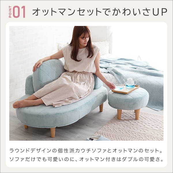 大人可愛いコンパクトカウチソファ!丸みのあるシルエットでふんわりとしたデザインが特徴です。1roomにお住まいの方におススメなサイズ感です。オットマン付きなので、サイドテーブルや脚置きにしたり自由にお使い頂けます。座面にはポケットコイルを搭載しており、耐久性と弾力のある上質な座り心地です。