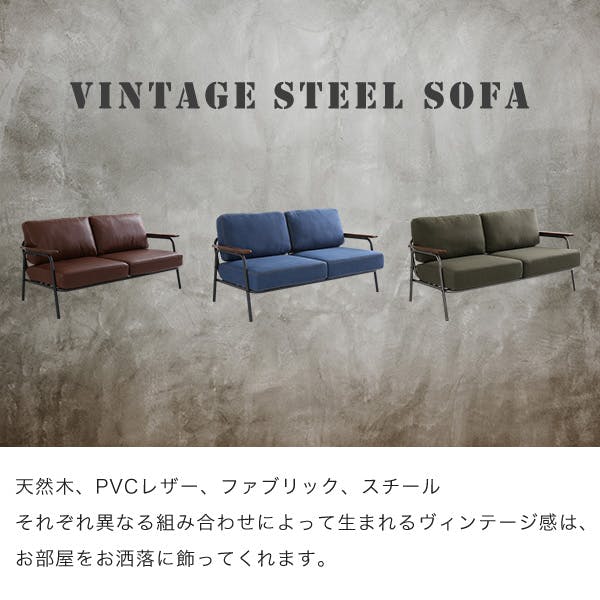 お部屋をお洒落に飾るヴィンテージ風ソファ!スチールフレームがマットな仕上がりを演出!肘部分はキズに強いメラミン加工!カラーは選べる3色展開!※グリーン、ブルーは廃番です。