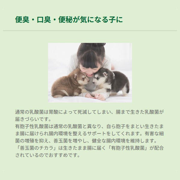 「善玉菌のチカラ」の与え方 犬用顆粒・猫用顆粒は愛犬・愛猫の体重に合わせて毎日のごはんにふりかけて与えてください。わんちゃん・ねこちゃんの便や健康状態を確認し、セレクトバランスと「善玉菌のチカラ」を一緒に継続的に摂取することで腸内環境を整え、健康な身体を維持しましょう。