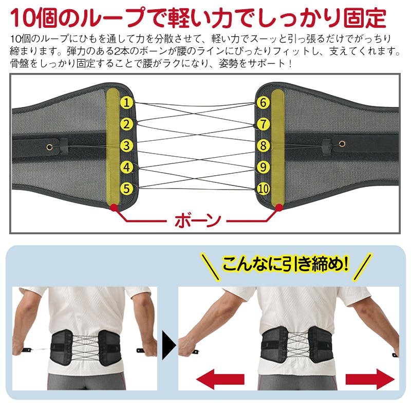 1.ベルトの両端を持って腰の位置(腰骨あたり)にあてます。2.片側のベルト(面ファスナーメス側)をお腹側で押さえます。3.反対側のベルトを強めに引っ張り、面ファスナーでとめます。4.ベルトからストラップを外し、両手で持ちます。5.ストラップをしっかり持ち、同じ力で両側に引っ張ってください。6.お好みの締め具合に調節して、ストラップを本体ベルトにつけて完成です!※使い始めの頃は取扱説明書の図を参考にら装着してください。
