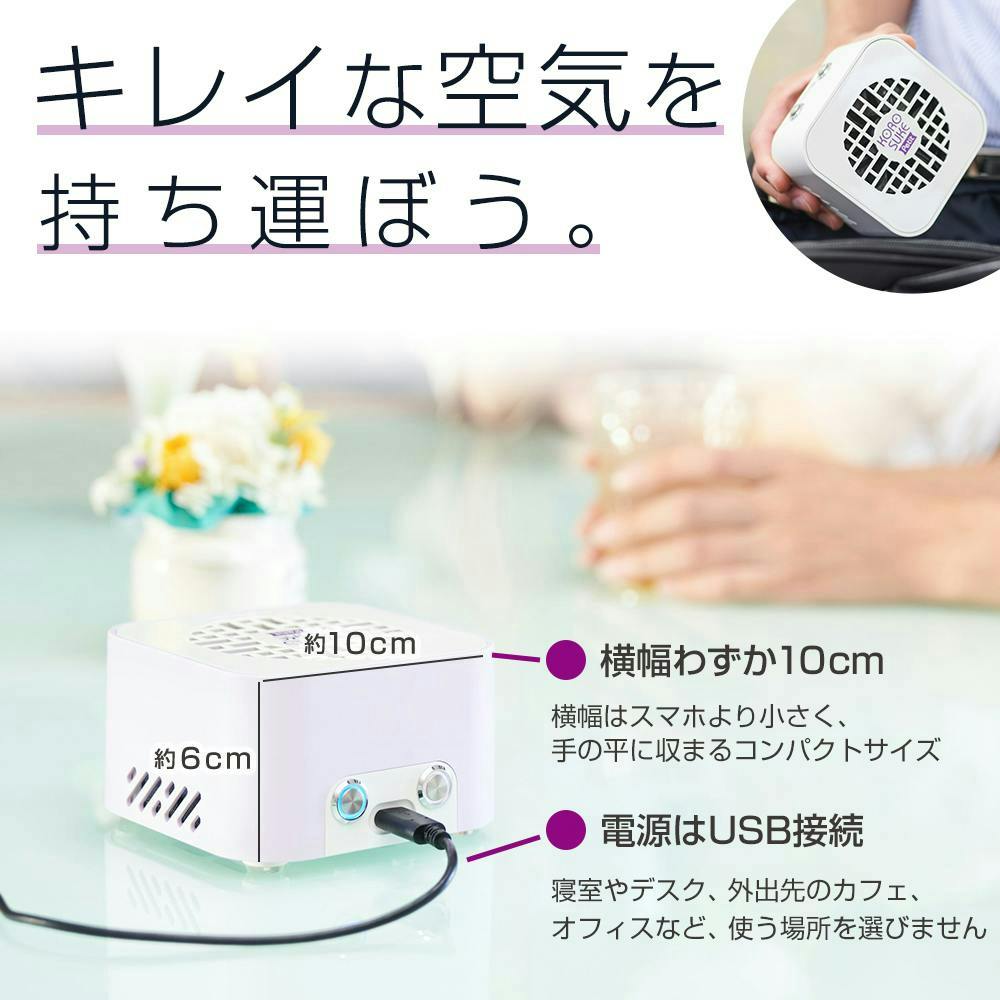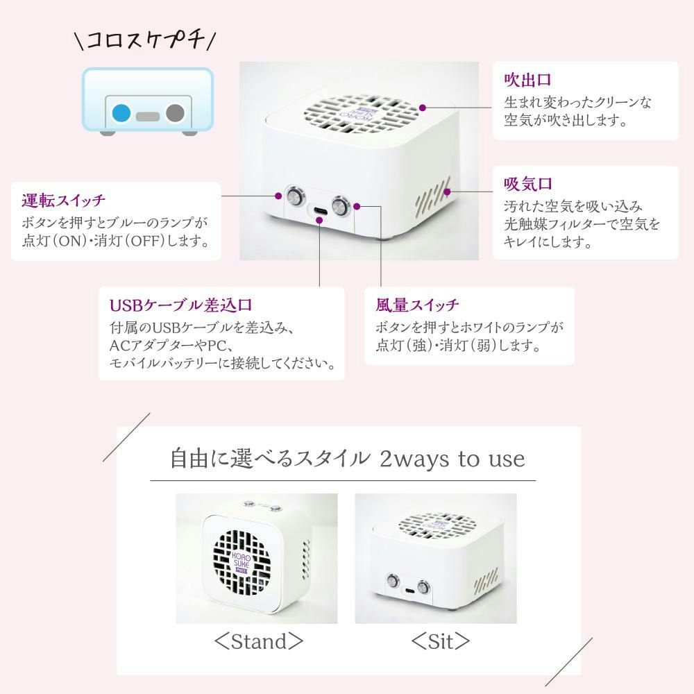 【持ち運びできる空気清浄機 コロスケプチ KOROSUKE Petit コーラルピンク 約102×102×62mm】 ちあふる USB給電 軽量 コンパクト 光触媒 UV-LED フィルター交換不要 日本製 消臭 花粉 PM2.5 JAN:4573566210252