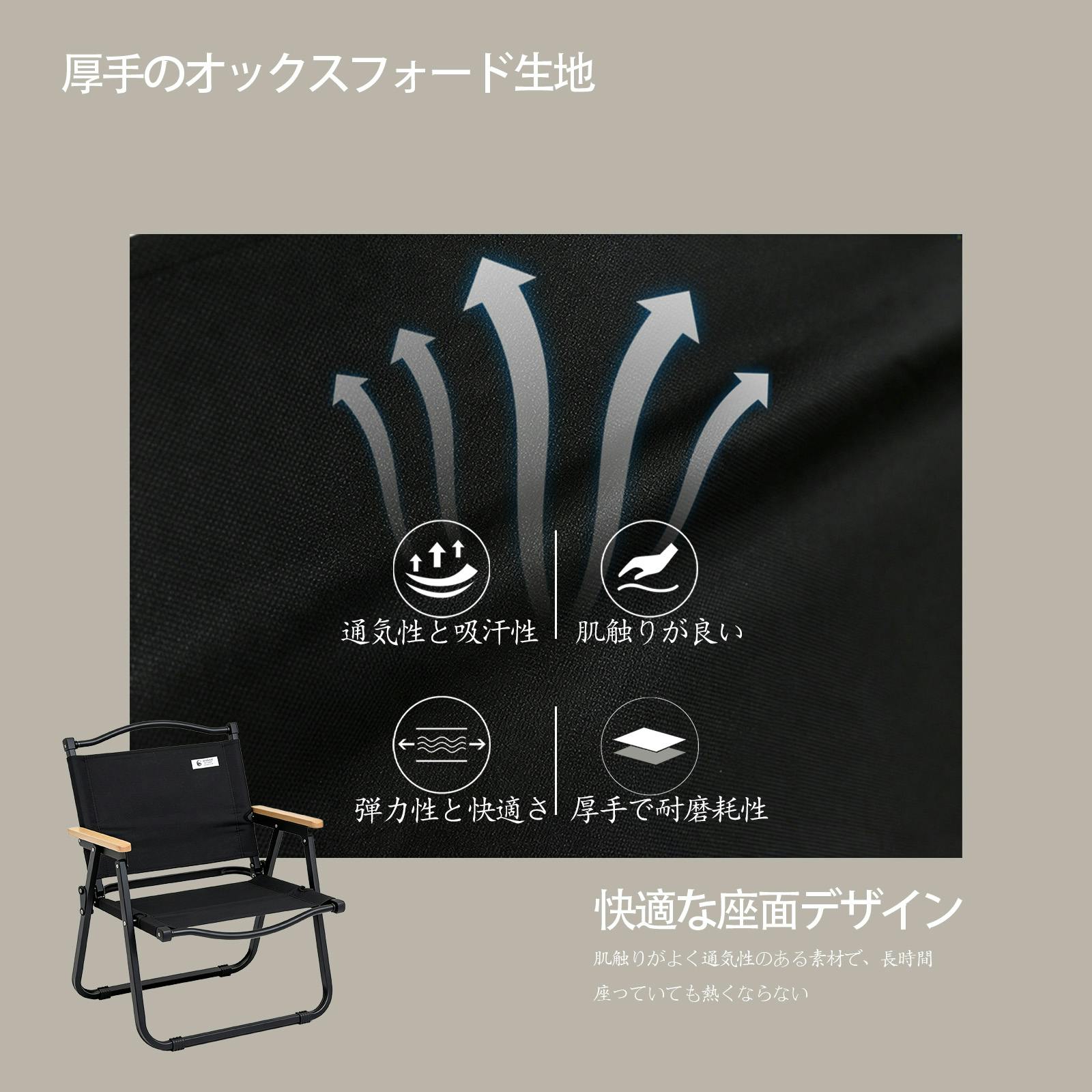 600D オックスフォードクロスを採用した座面は耐磨耗性に優れ、軽度の雨やスプリンクルでもタオル拭きで簡単に清掃可能。炭素鋼製のフレームは強度と軽量を兼ね備え、メッシュ構造による通気性設計で夏場の蒸し暑さを軽減。防滑フットパッドが地面にしっかり固定され、不安定な場所でも安定した座り心地を提供します