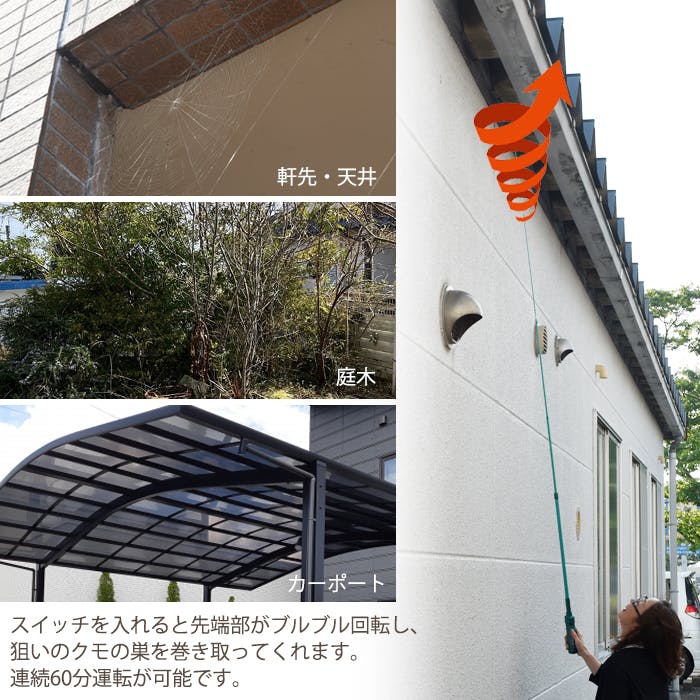 いや~なクモの巣を、簡単お手軽に除去!スイッチを入れると先端部がぶるぶる高速回転して、クモの巣を簡単に巻き取ってくれます。柄は伸縮式で伸びるので、今まで手が届かなかった高い所のクモの巣もスッキリ除去できます。