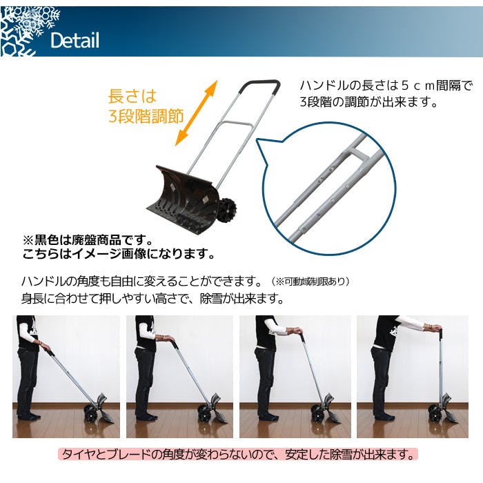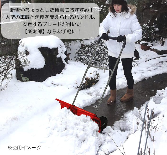 大きな車輪が付いた大型のスノープッシャー。新雪や少ない降雪時の除雪にオススメです。ハンドルの角度・高さを変えられるので、押しやすい高さで除雪が出来ます。ハンドルの角度が変わっても、タイヤとブレードの角度が変わらないので、安定して除雪が出来ます。自立するので、ちょっと手を放して休憩ができたり、使わないときの収納も簡単です!