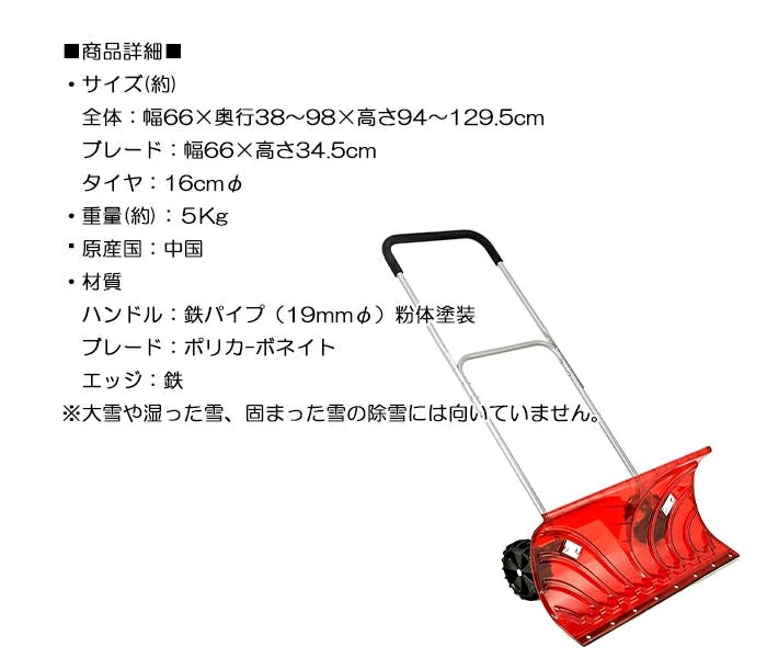 スノープッシャー レッド 車輪付き 除雪 雪かき キャスター付き 丈夫 ポリカーボネート ハンドル調節 手押し 除雪器 スノーダンプ