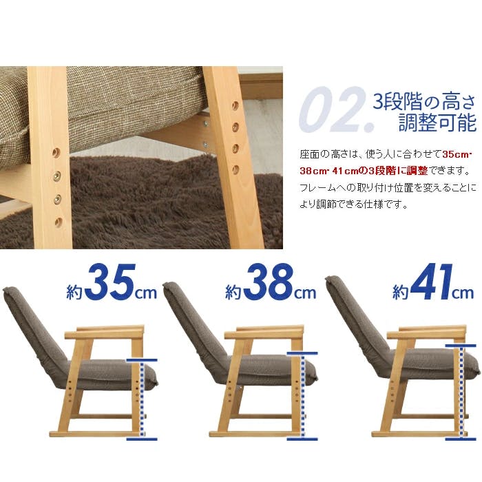 座面にポケットコイルを使用しているため、へたりが少なく弾力性のある贅沢な座り心地です。座面高さは3段階の切り替えが可能。背もたれは、3段階のリクライニング仕様です。