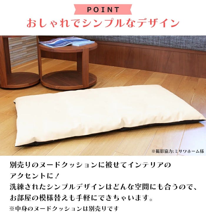 高級感のある合皮レザーを使用した60×120cm用長座布団カバーです。色はアイボリー。ファスナー付きでお手持ちの長座布団の出し入れも容易です。水や汚れに強いレザー素材を使用しているので、飲み物や食べ物をこぼしてもサッと拭き取ることができます。(裏面は黒のナイロン系生地となっております。)※カバーのみの販売ページのため、中身用座布団は付属しておりません。別途ご用意ください。