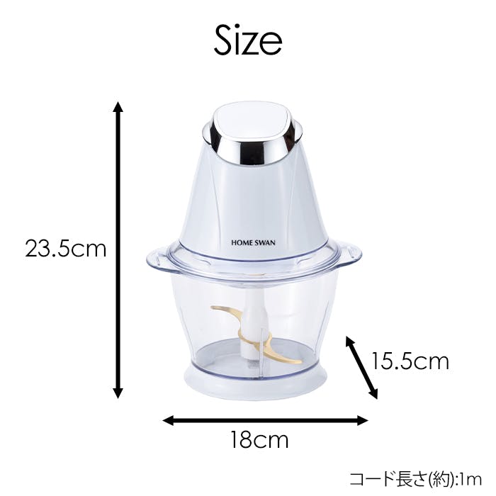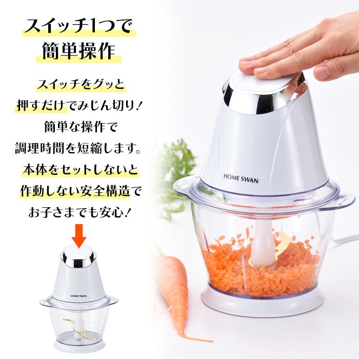 電動で手軽にみじん切りができるフードチョッパー。プラスチック容器で軽く、持ち運びもラクラク。大根おろしが作れる便利なアタッチメント付きです。セットしないと作動しない安全構造と、分解洗浄できる設計で安心・清潔に使えます。
