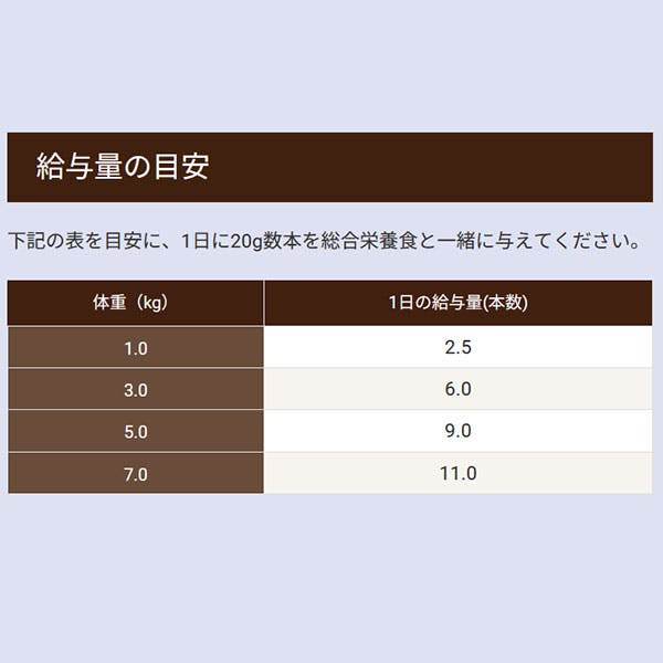 たんぱく質 11.5%以上 脂肪 1.0%以上 粗繊維 0.2%以下 灰分 0.8%以下 水分 86.5%以下