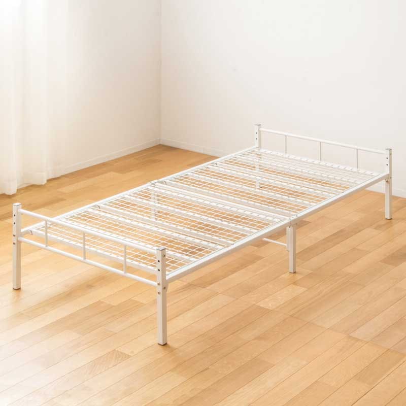 シンプルかつ機能的なヘッドレスパイプベッドシンプルでお部屋が広く感じるヘッドレスベッド。ベッド下は広々とした 収納スペースになり、お部屋もスッキリ!こだわりの頑丈設計で安心の眠りを お届けします。床面の高さを2段階で調節可能です。マットレスの厚さや、ベッド 下の収納用途に合わせて、お好みの高さにできます。就寝中の発汗による湿気の こもりも、通気性の良いメッシュ床板ならこもりをある程度カビやダニの発生を 抑制します。