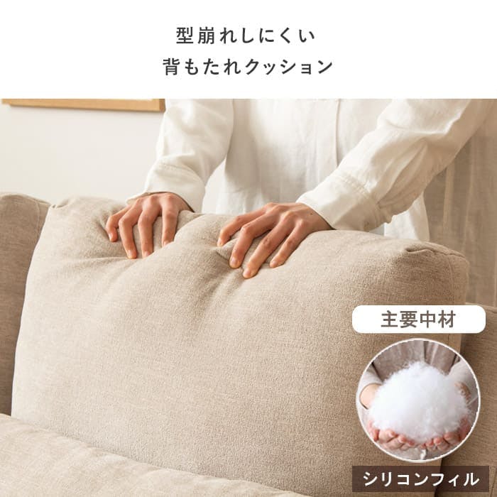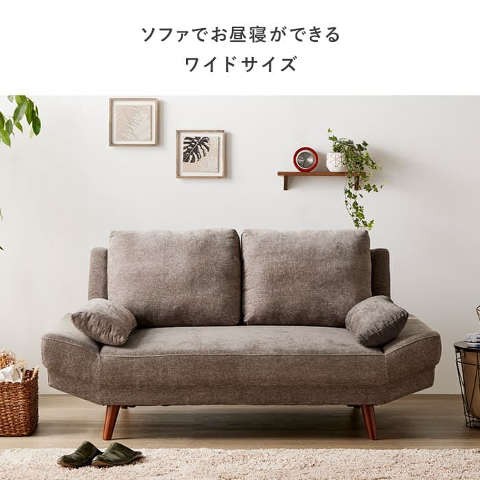 ひろびろワイド座面で極上のくつろぎ ソファでごろんとお昼寝ができるワイドサイズソファ。 肘の部分が傾斜した特徴的なデザインは、横になった時に頭をあずけやすくするためで、 ソファベッドのようにお使いいただけます。 枕にしたり肘置きにも使えるロングクッション2個付きです。