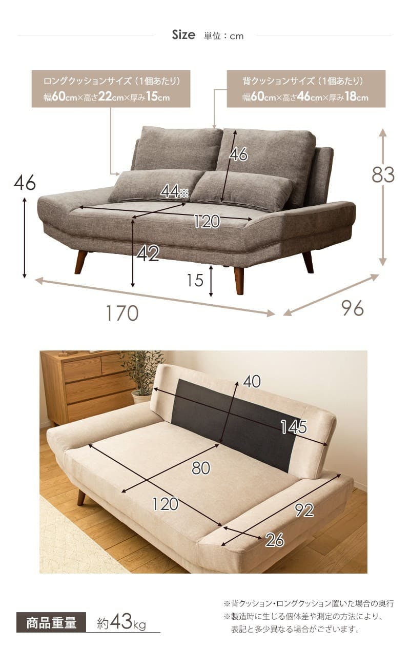 本体:幅170×奥行96×高さ83cm、座面:幅120×奥行44×高さ42cm、肘部:高さ46cm、脚部:高さ15cm
