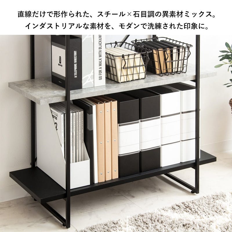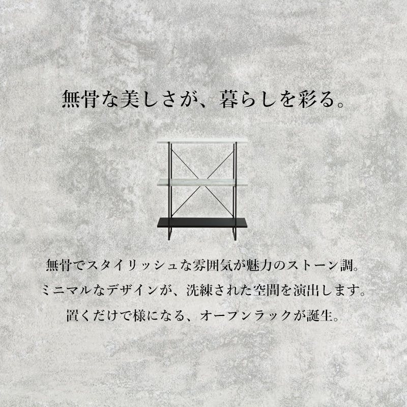 無骨で洗練。ストーン調デザインと省スペース収納が魅力のミニマルオープンラック。 無骨でスタイリッシュな雰囲気が魅力のストーン調を生かしたオープンラック。 細身のフレームを採用したミニマルなデザインが、洗練された空間を演出。 省スペースでも抜群の収納力でお部屋がすっきり。A4ファイルサイズも収納できます。 リビング、書斎、寝室、お部屋の間仕切りなど、様々なシーンで活躍します。 安定試験実施済の頑丈設計もポイント。