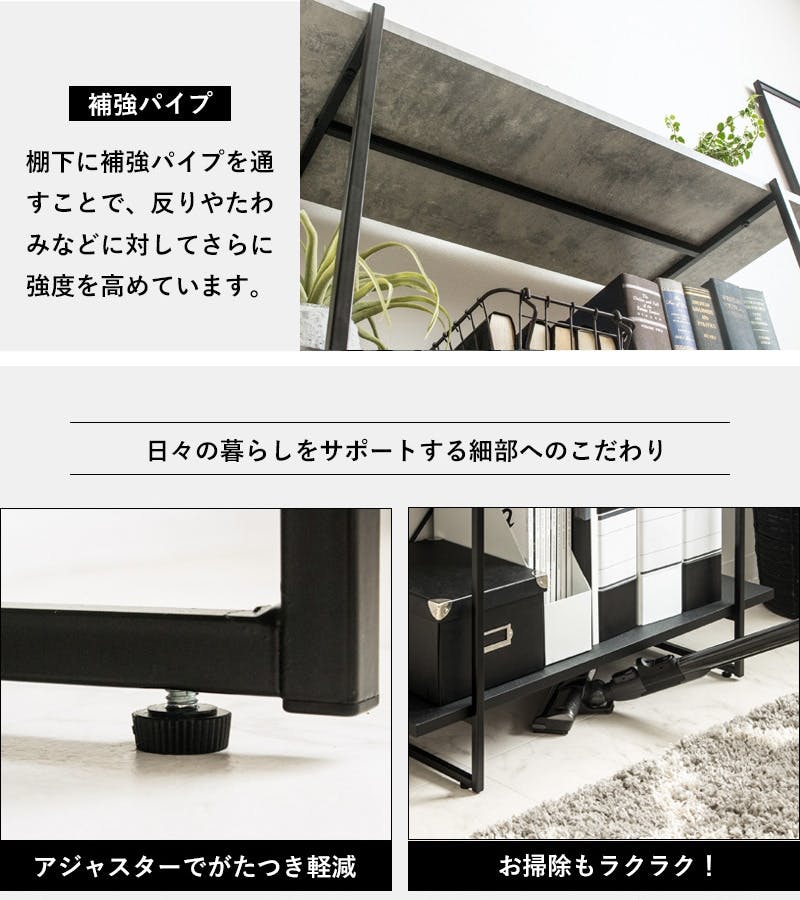 棚板:ストーン×ブラック、フレーム:ブラック、本体重量:約11.2kg、耐荷重:(棚板1枚あたり)約15kg、アジャスター付き、梱包サイズ:100×35×11cm/12.5kg、お客様組み立て品[組み立て時間目安:約30分]