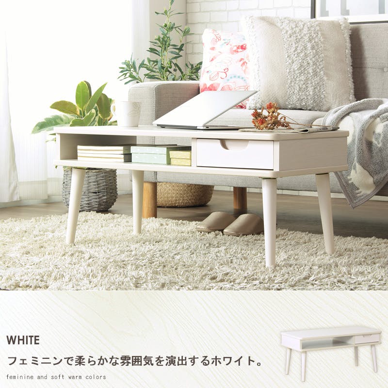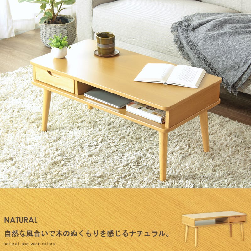 コンパクトでも収納力はしっかりキープ♪木のぬくもりを感じる、かわいいローテーブル。 コンパクトながらしっかりとした収納力を持つローテーブル「サニー」は、木のぬくもりを感じさせる可愛いデザインです。部屋を広く使いたい方のために、雑誌や新聞、ノートパソコンが収納できる棚と小物用の引き出しを備えており、テーブル周りをすっきりまとめられます。丸みのあるフォルムと温かみのある木の素材感が絶妙にマッチし、ソファの前や1人暮らしのフロアライフに最適です。