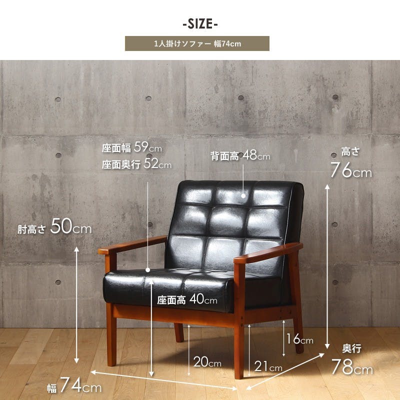 本体:幅74×奥行78×高さ76cm、座面:幅59×奥行52×高さ40cm、背もたれ:高さ48cm、肘:高さ50cm