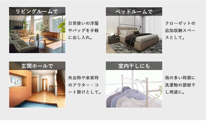 お洒落にコーディネートを楽しむ、シンプルで洗練されたハンガーラック。お気に入りをディスプレイしながら収納でき、どんなお部屋にもぴったり。 「今日何を着て行こうかな?」と、毎日のコーディネート選びをお洒落に楽しめるハンガーラック。お気に入りの洋服や小物を素敵にディスプレイしながら、収納できるシンプルで洗練されたデザインです。どんなお部屋にも馴染みやすいカラーで、インテリアにもぴったり。お洒落な空間で、毎日のスタイリングがもっと楽しくなります。