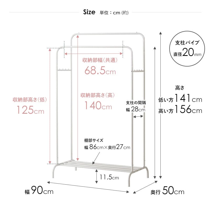 本体:幅90×奥行50×高さ156cm、棚部:幅86×奥行27cm、パイプ径:2cm
