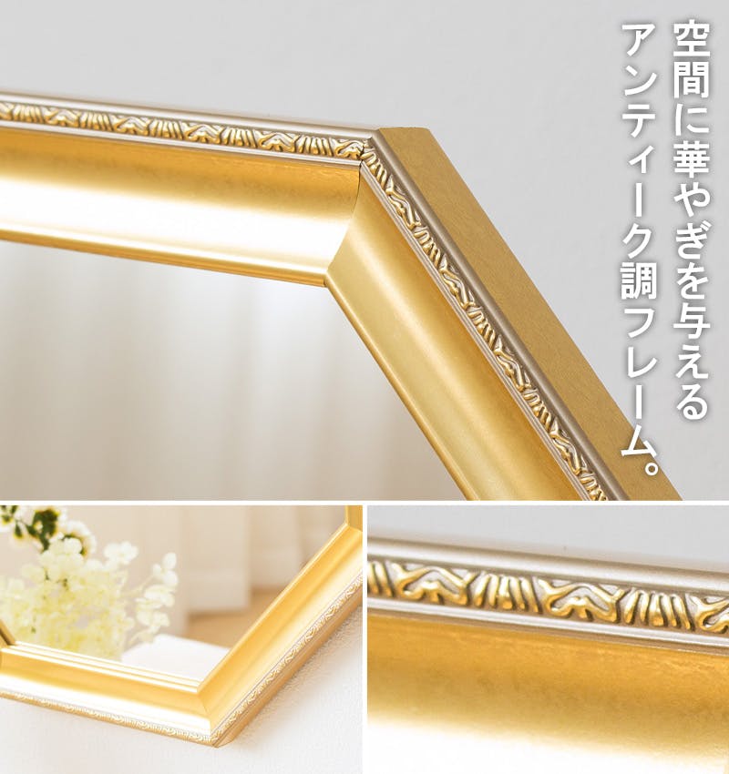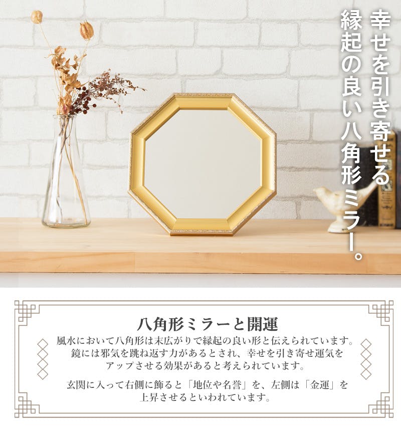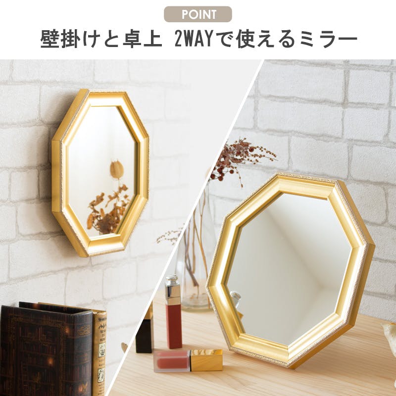 アンティーク調の八角形フレームミラー 細やかな装飾が目を惹く、気品漂うアンティーク調の八角形フレームミラー。 ゴールドカラーがインテリアに華やかさを添え、光を取り込むことでお部屋を明るく広々と見せてくれます。 壁掛けと卓上の2通りの使い方が可能で、リビングや寝室、廊下、洗面など、どこにでも手軽に設置できます。 クラシカルなデザインと実用性を兼ね備えた一枚で、空間をより魅力的に演出します。