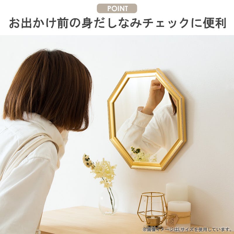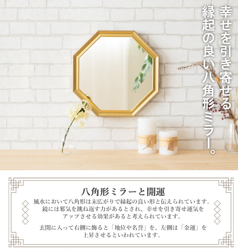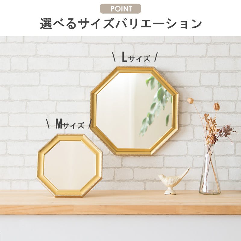 アンティーク調の八角形フレームミラー 細やかな装飾が目を惹く、気品漂うアンティーク調の八角形フレームミラー。 ゴールドカラーがインテリアに華やかさを添え、光を取り込むことでお部屋を明るく広々と見せてくれます。 壁掛けと卓上の2通りの使い方が可能で、リビングや寝室、廊下、洗面など、どこにでも手軽に設置できます。 クラシカルなデザインと実用性を兼ね備えた一枚で、空間をより魅力的に演出します。