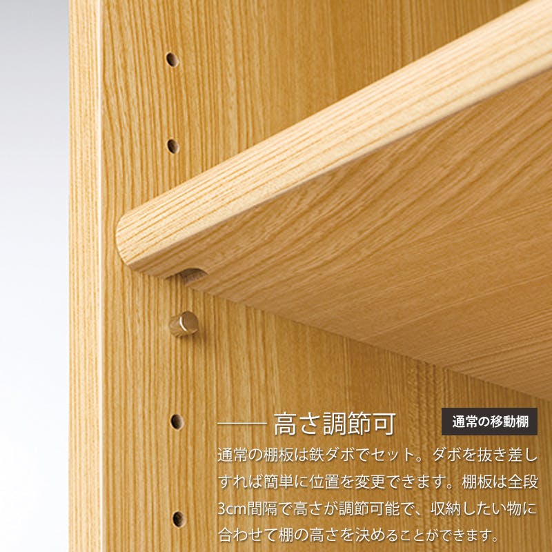 色:ナチュラル、ブラウン、ホワイト(木目)、ライトナチュラル、ダークブラウン、移動棚4枚、移動固定棚2枚、耐荷重:天板20kg・棚板10kg、ホルムアルデヒド放散区分:F★★★★、お客様組立品[組立の目安:60~90分程度]、中央縦に仕切り板があります