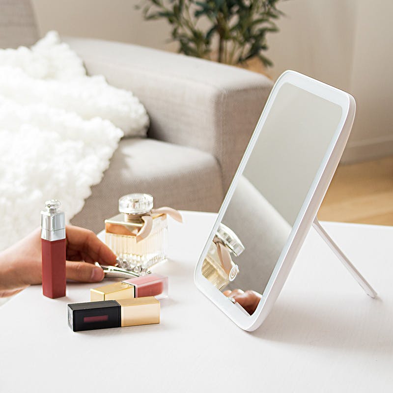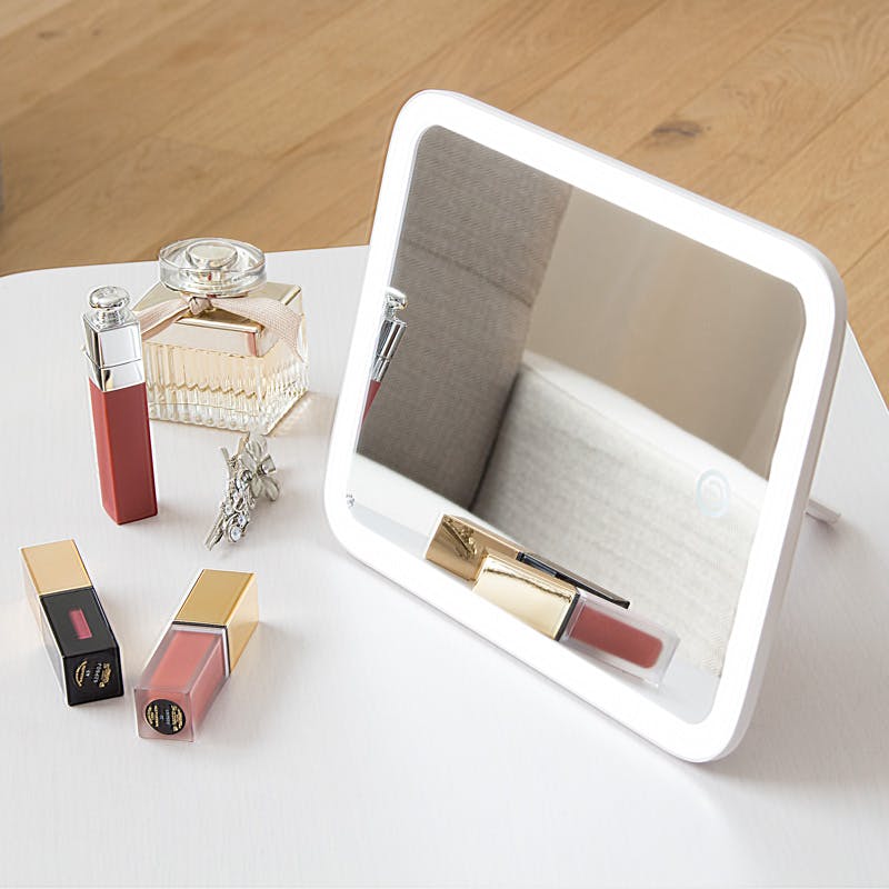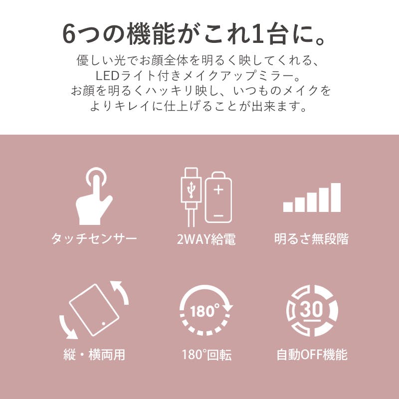 6つの機能を備えたLEDライト付きメイクアップミラー これ1台で6つの機能を搭載した多機能メイクアップミラー。 優しいLEDライトがお顔全体を明るく照らし、メイクをよりキレイに仕上げるサポートをします。 お顔を明るくハッキリ映し出すので、細部の確認やメイクの仕上がりが格段にアップ。 日常のメイクがより楽しく、快適になる一台です。