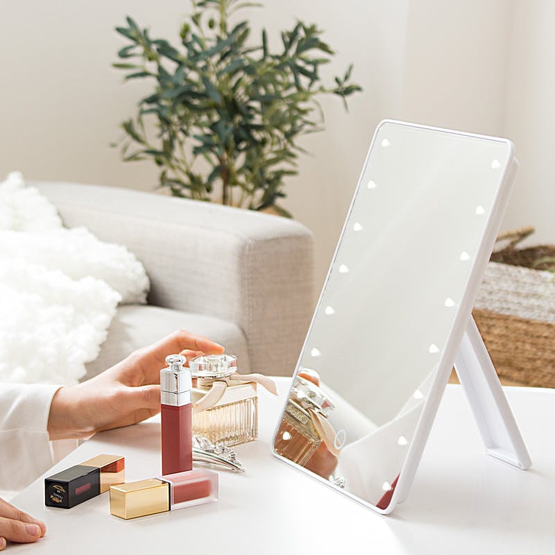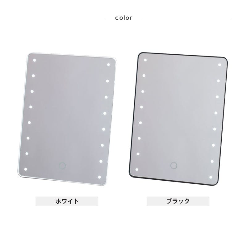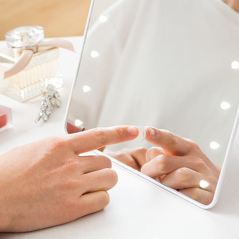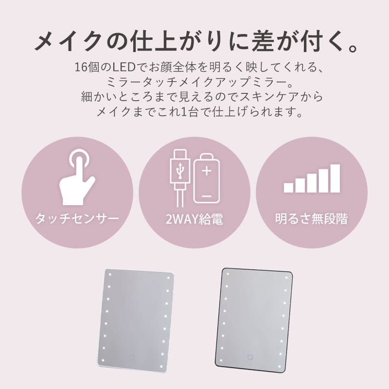 メイクの仕上がりに差がつくLEDライト付きメイクアップミラー 16個のLEDライトが、お顔全体を明るく照らしてくれる「ミラータッチメイクアップミラー」。 細かい部分までしっかり見えるので、スキンケアからメイクまでこれ1台で完璧に仕上げられます。 明るくクリアな映りで、日々のメイクをさらに美しく、快適にサポートします。