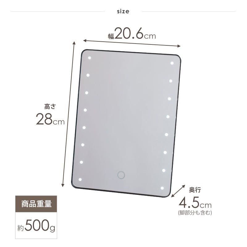 本体:約幅20×奥行4.5×高さ28cm(脚部分も含む)、パッケージサイズ:約幅21×奥行5×高さ28.5cm、鏡サイズ:約幅20×高さ27.5cm