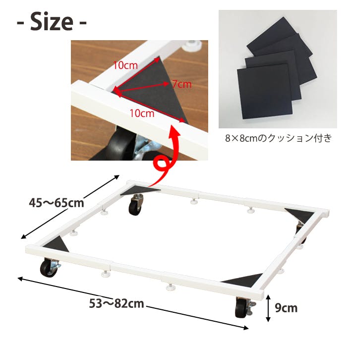 ■年末年始特別価格!この機会にぜひお買い求めください! ■ご家庭の洗濯機に。サイズ調整ができる伸縮式の洗濯機台です。キャスター付きで移動やお掃除もラクラク。振動を軽減するクッションマット付き。洗濯機以外にも段ボールやコンテナなどいろんな用途で活用できます。