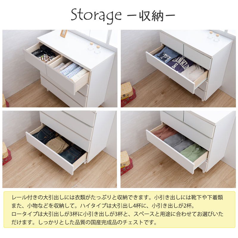 ■商品サイズ/本体:(約)幅119.5×奥行40×高さ68.5cm(脚部10cm含む)■引出し内寸(共通)/小:(約)幅33.5×奥行33.5×深さ11.5(ハイ有効14.5、ロー有効13)cm、大:(約)幅70.5×奥行33.5×深さ11.5(有効13)cm■耐荷重量/天板:(約)20kg■商品重量/(約)31kg■日本製■完成品(脚部のみ取付け)