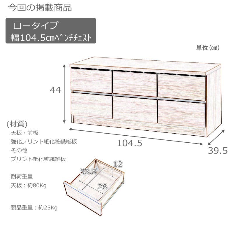 ■商品サイズ/本体:(約)幅104.5×奥行39.5×高さ44cm、引出有効内寸:(約)幅26×奥行33.5×高さ12cm■商品重量/(約)25kg■商品耐荷重/天板:80kg■日本製■完成品
