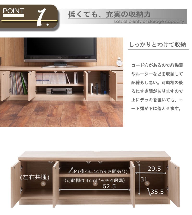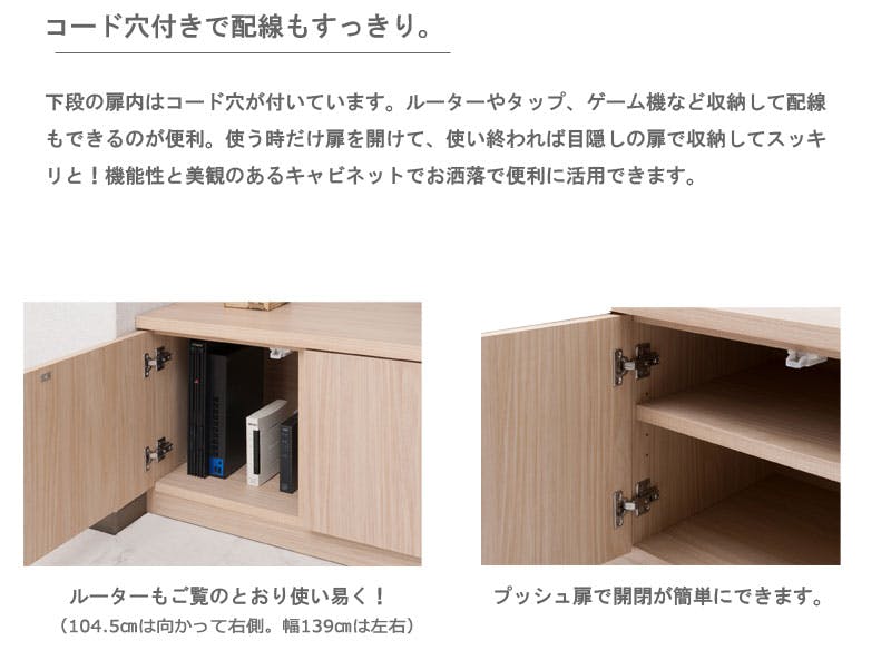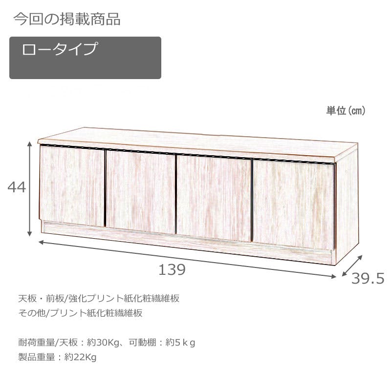 ■商品サイズ/本体:(約)幅139×奥行39.5×高さ44cm、扉内有効内寸/中扉内:(約)幅62.5×奥行35.5×高さ31cm、左右扉内:(約)幅29.5×奥行35.5×高さ31cm■商品重量/(約)22kg■商品耐荷重/天板:30kg、可動棚:5㎏■日本製■完成品
