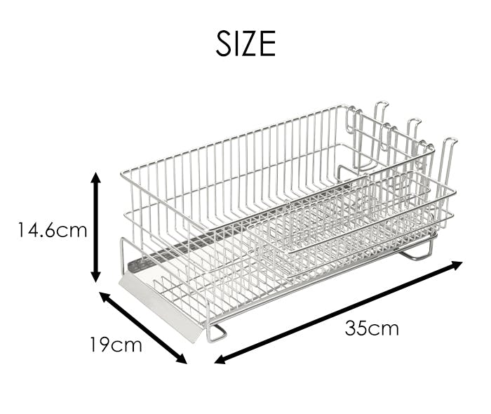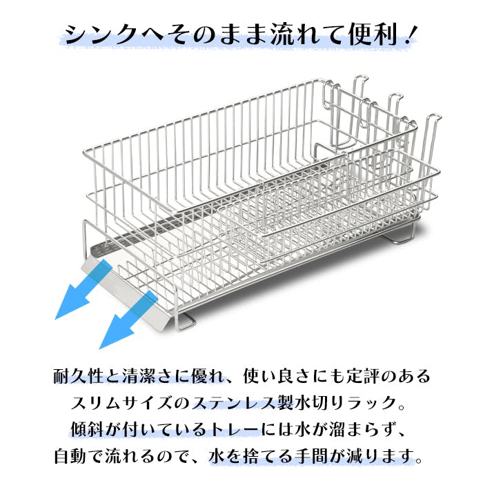 耐久性と清潔さに優れ、使い良さにも定評のあるスリムサイズのステンレス製水切りラック。傾斜が付いているトレーには水が溜まらず、自動で流れるので、水を捨てる手間が減ります。便利なカトラリーケースとグラススタンド付きです。