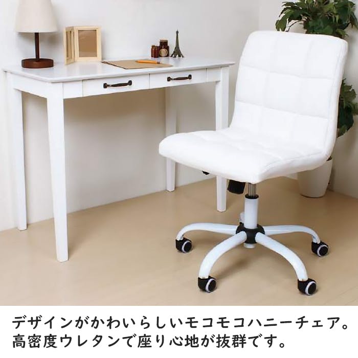 座面昇降(ガスシリンダー式)機能とロッキング機能を備え、快適な座り心地を実現しました。クッションには高密度ウレタンを使用し、長時間座っても疲れにくい仕様です。キャスターには、フローリングなどの硬い床を傷つけにくいポリウレタンキャスターを採用。ころんとしたフォルムがかわいらしい、モコモコデザインのハニーチェアです。