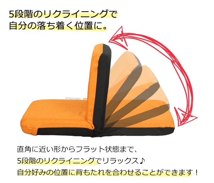 カラフルなリクライニング座椅子。5段階リクライニングでお好みの角度でゆったりできます。コンパクト設計で持ち運びもラクラク。お子様用や来客用にも活躍します。