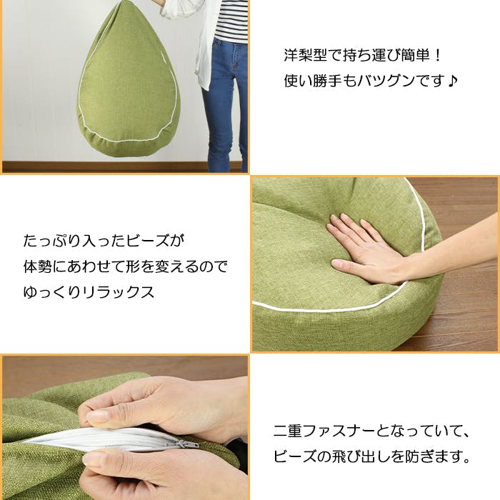 洋梨型のかわいいビーズクッションです。背当てクッションのようにもたれてみたり、フロアークッションのように座ってみたり。ちょっとした時間でもリラックス♪ビーズクッションはその時の体勢にフィットするように形状を変えるので使いやすい!