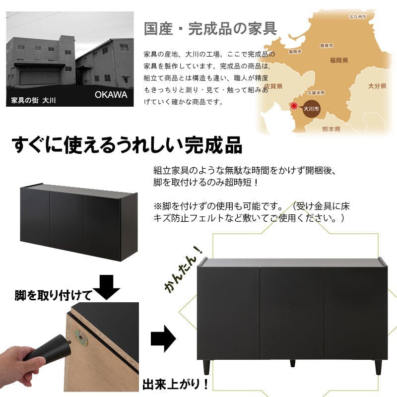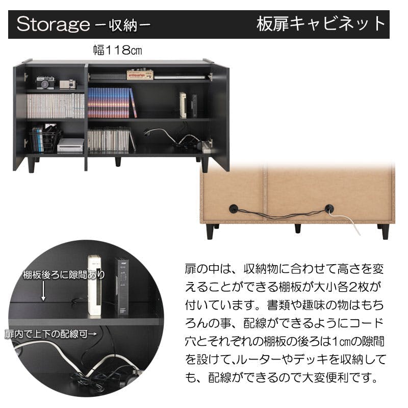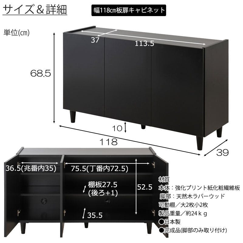 ■商品サイズ/本体:(約)幅118×奥行39×高さ68.5(脚部10含む)cm■扉内寸/(約)幅(大)72.5(小)35×奥行35.5(棚板27.5後部1cm配線用隙間あり)×高さ52.5cm■棚板/可動式:(大)2(小)2枚(6cmピッチ・6段階)■商品重量/(約)24kg■耐荷重量/天板:(約)20kg、棚板:(約)5kg■日本製■完成品(脚部のみ取付)