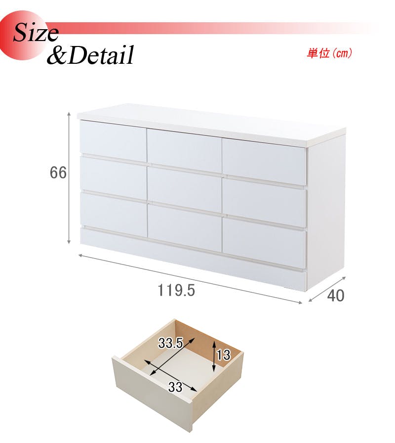 ■商品サイズ/本体:(約)幅119.5×奥行40×高さ66cm<br>■引出し内寸/共通(約)幅33×奥行33.5×深さ13cm<br>■耐荷重量/天板:(約)20kg■商品重量/(約)34kg<br>■日本製■完成品