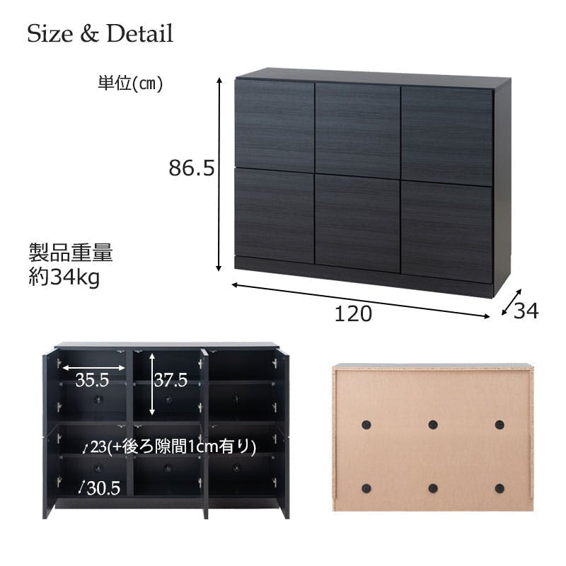 ■商品サイズ/本体:(約)幅120×奥行34×高さ86.5cm■扉内寸/(約)幅35.5×奥行30.5(棚板23後部1cm配線用隙間あり)×高さ37.5cm■棚板/可動式:6枚(6cmピッチ・5段階)■耐荷重量/天板:(約)20kg、棚板:(約)5kg■商品重量:(約)34kg■日本製■完成品