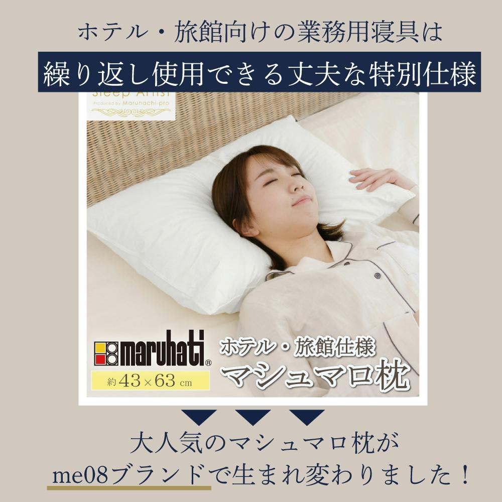 人気のマシュマロ枕が、新ブランド「me08」として生まれ変わりました。変わらない上質な寝心地を、より手に取りやすい価格でお届けします。 〇ふんわりマシュマロのような寝心地まるでマシュマロのようなやわらかさで、頭と首を優しく包み込みます。適度な弾力性で沈み込みすぎず、理想的な寝姿勢をサポート。毎晩の眠りを心地よいひとときに変えてくれる枕です。