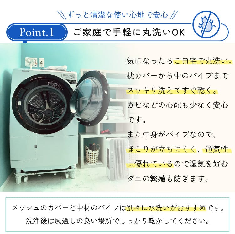 【あなたに合わせて枕の形は自由自在】頭を乗せれば中のパイプがあなたの体に合わせてぴったりフィット。仰向けでも横向きでも頭を乗せるだけでベストポジションが決まります。【いつでも清潔・丸洗いが可能】皮脂の臭いや汗のシミも丸洗いで簡単にきれいに!パイプだから、ダニ・チリ・ホコリとも無縁です。側生地も中身も通気性・速乾性が高いポリエステル素材なので洗濯後もすぐに乾きます。