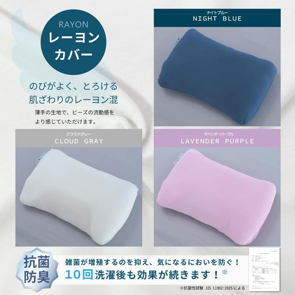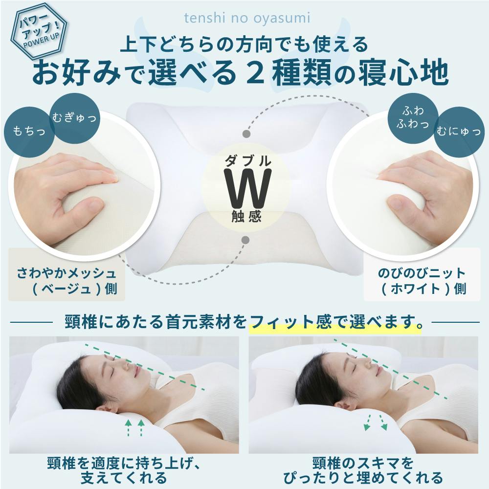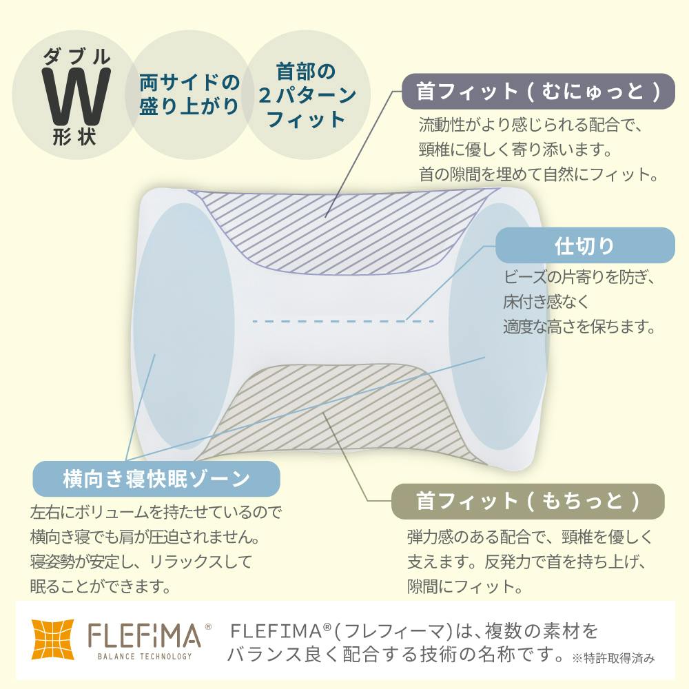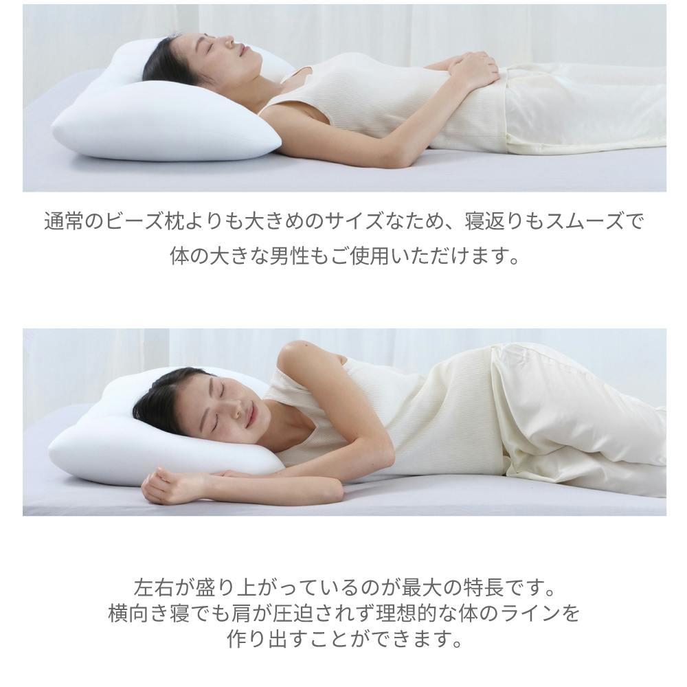 〇枕ひとつで2種類の寝心地!上下どちらの方向でも使用でき、お好みの寝心地を選べる〇5つの素材を絶妙な割合でブレンドすることで、フィット感を追求した新感覚の触感が特徴の枕〇首の形に沿ってしっかり支えるだけでなく、頭や後頭部も包み込んで支えてくれ、全方位フィット!〇通常のビーズ枕よりも大きめサイズなため、寝返りもスムーズ!