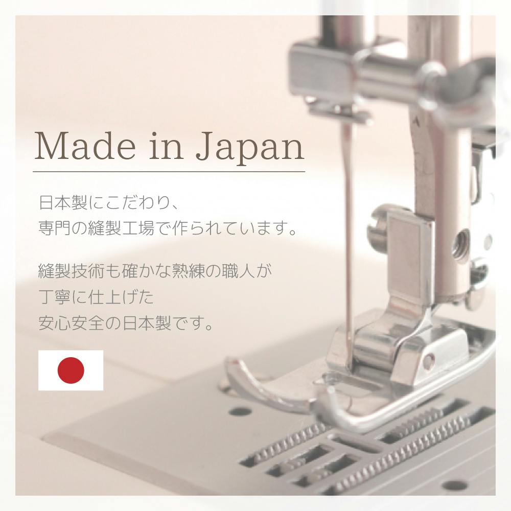 日本製にこだわり、専門の縫製工場で作られています。縫製技術も確かな熟練の職人が丁寧に仕上げた安心安全の日本製です。 綿素材は保水性があるので洗濯の揉みや絞りで強い力が加わると形状が変わりやすく、シワが残りやすくなります。脱水後には早めに取り出し、上から下に強く振ってから干すとシワ防止になります。風通しの良い陰干しも効果的です。また、柔軟剤と一緒に洗濯ネットを使用することで水中で大きく動かないため、シワが防げます。
