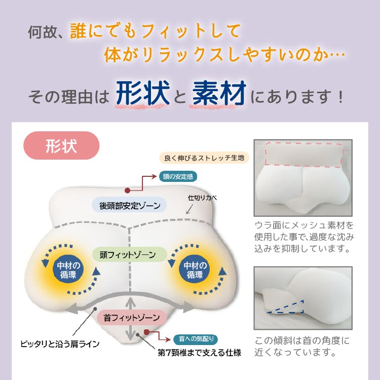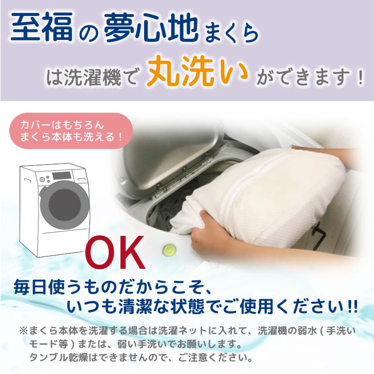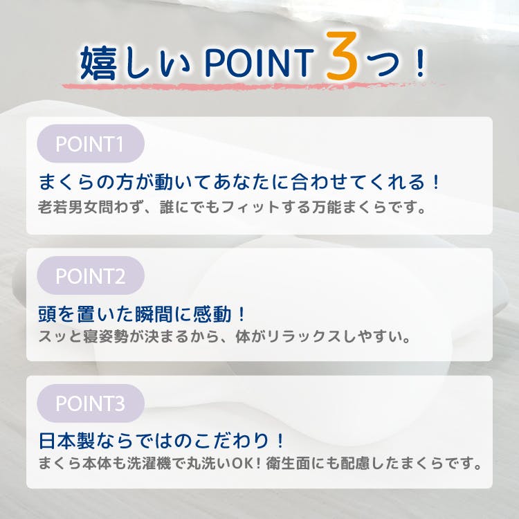 枕の方が動いてあなたに合わせてくれる!老若男女問わず、誰にでもフィットする万能まくらです。頭を置いた瞬間に感動!スッと寝姿勢が決まるから、身体がリラックスしやすい。日本製ならではのこだわり!枕本体も洗濯機で丸洗いOK!衛生面にも配慮した枕です。